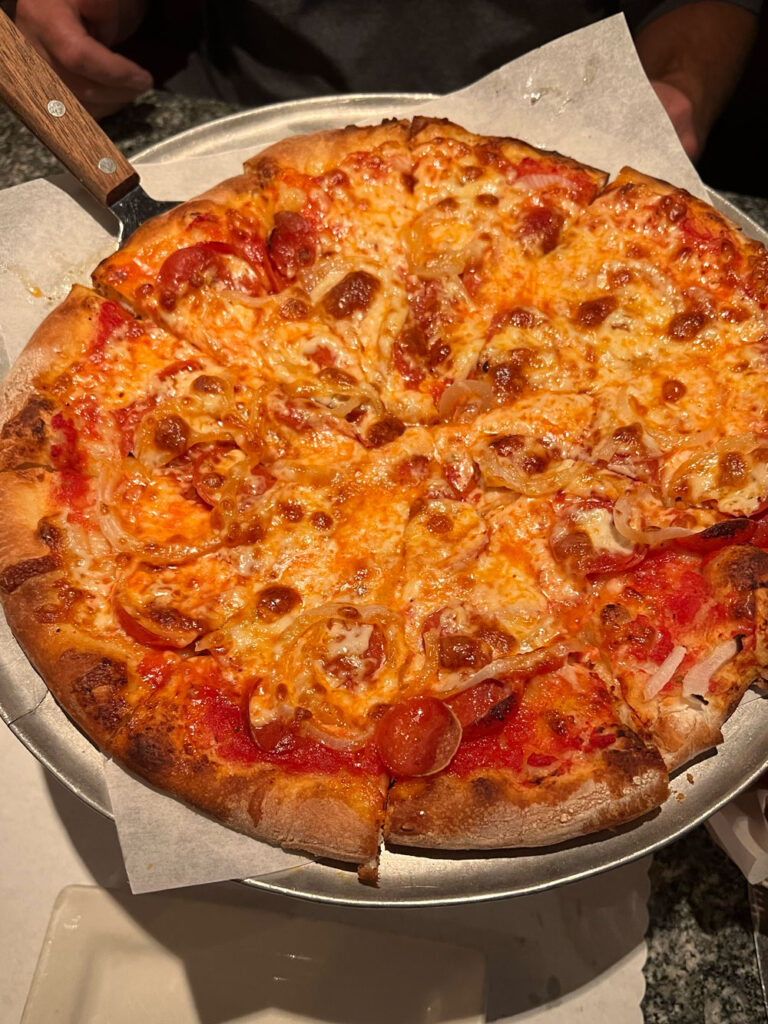 I should add that we do have a favorite way to order the pizza. Scot swears the proportions are the best when you order a medium pizza. So, we get medium pizzas with either just cheese or pepperoni, onion, and mushroom on it but we always order them “slightly easy cheese and crispy”. That’s the secret! We also love their sausage (yummy fennel flavor) and of course I love their black olives. I’m not a fan of the way they have their green peppers though.